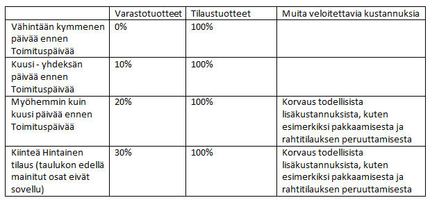 Tilausta voi muuttaa Tilauksen muuttaminen -käytännön mukaisesti siihen saakka, että Toimituspäivään on viisi* päivää. Toimitusta voidaan aikaistaa, jos Tuote on saatavilla Toimitusta varten toivottuna päivänä. Jos Toimitusta lykätään, Kiinteään Hintaan lisätään lisämaksu, jos lisämaksu olisi peritty myös siinä tapauksessa, että tilaus olisi alun perinkin toimitettu kyseisenä myöhempänä Toimituspäivänä.